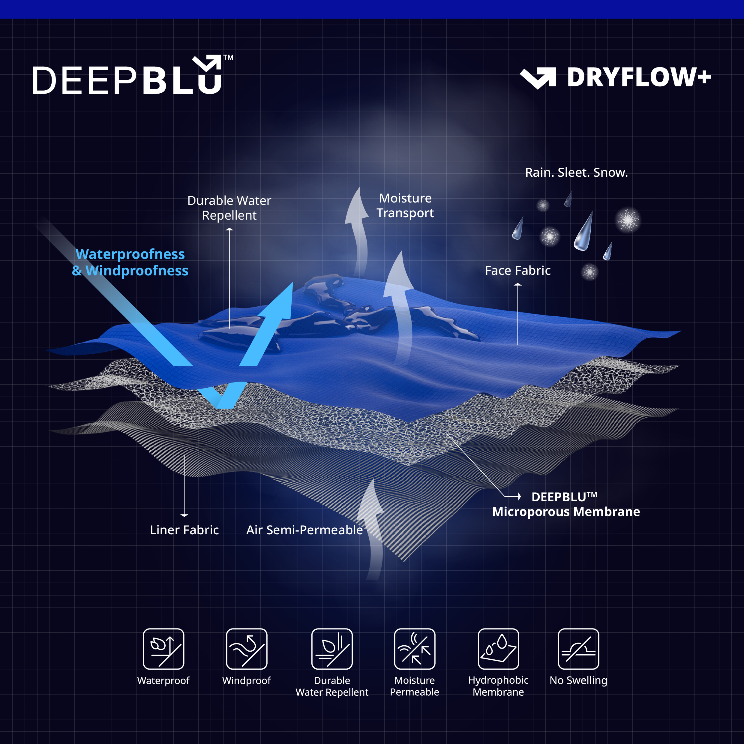 动态微气候调节:防水同时导湿半透气。通过高效导出运动产生的汗液蒸汽和代谢热量,维持体表微环境持久干爽,有效降低蒸发散热带来的能量损耗。